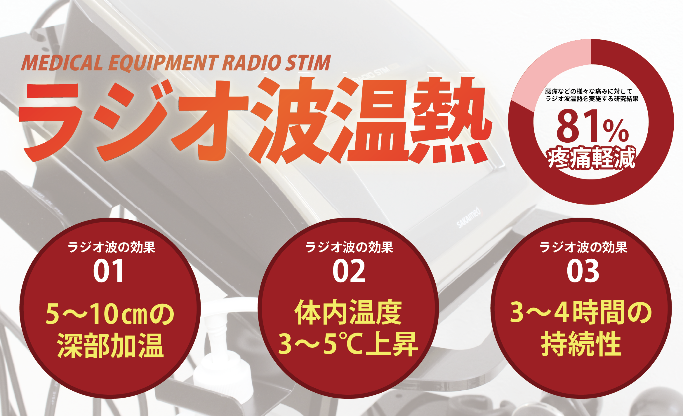 ラジオ波には、いくつか特徴的な効果があります。それらは、肩・腰の不調・関節痛・基礎代謝や免疫機能の向上・自律神経のバランス改善・疲労回復などに役立ちます。