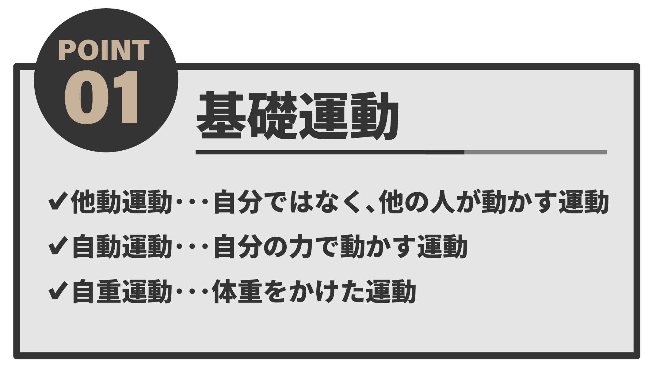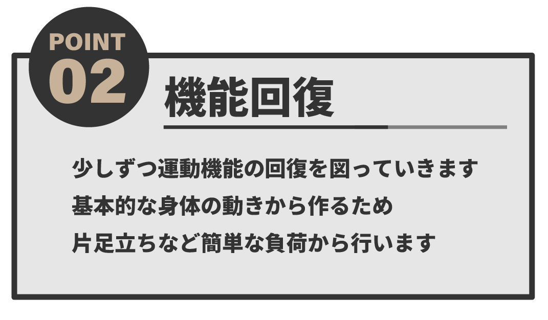 〈痛みが良くなった=運動が出来る〉ではありません。多くの場合、運動機能が低下しているため基本的な動作から見直していくのが一般的です。