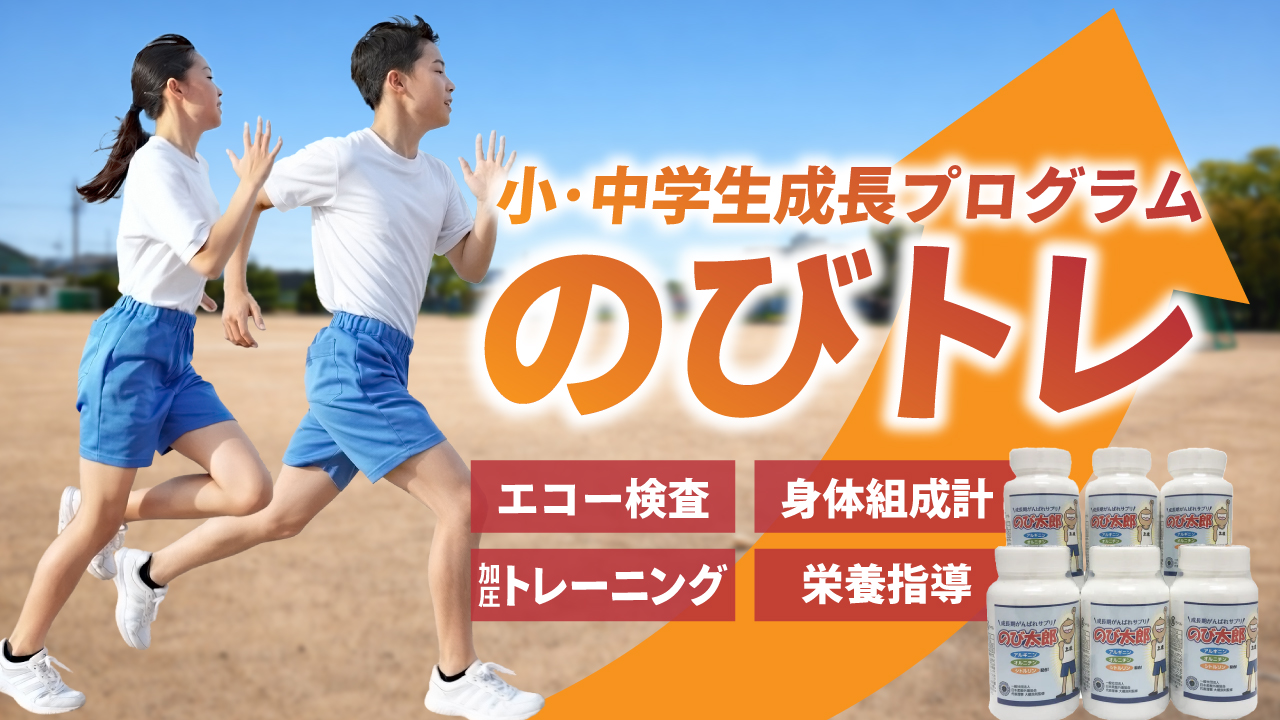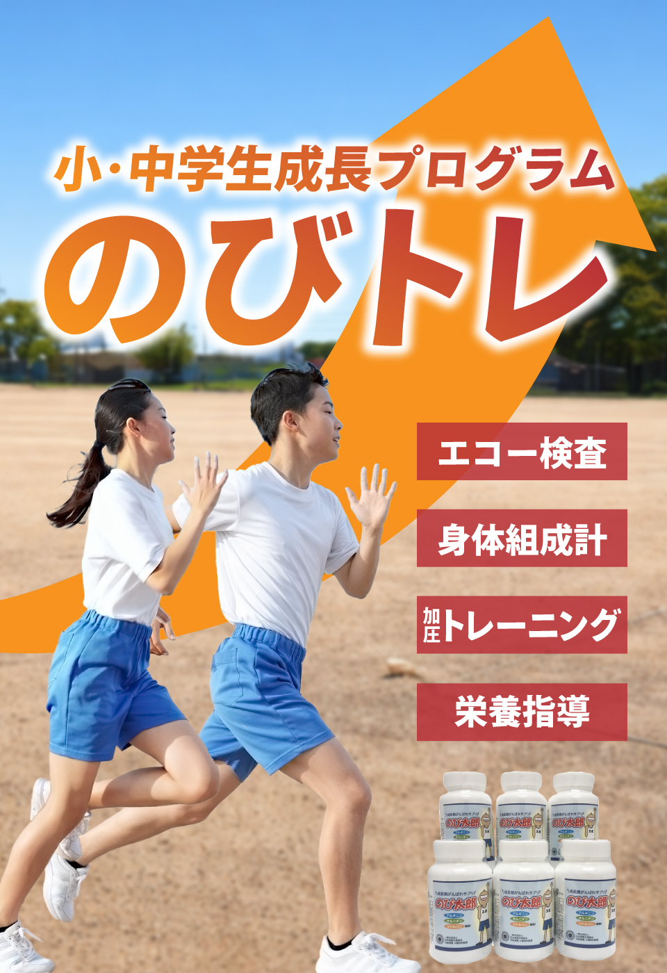 対象の年齢は、成長スパートに当てはまる小学生~中学生となります。骨端線の有無を含めてエコー検査を実施したうえでサプリメント摂取についてご検討いただけますので、ご安心ください。