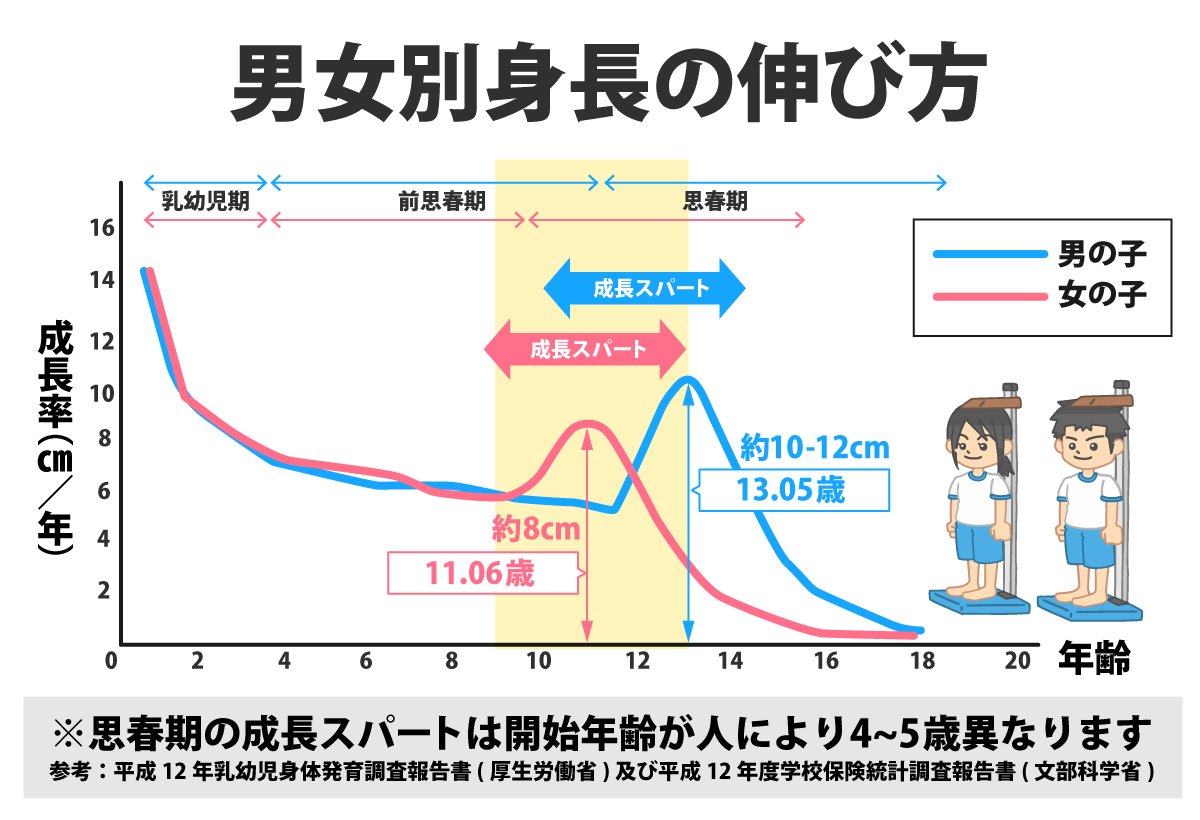 人の成長は生涯で2回急激に起こる時期があります。1度目が乳児期であり、2度目が“成長スパート”と呼ばれる小学校高学年~中学校にかけて起こる成長期です。身長が急激に伸びる時期に、睡眠・食事・運動に集中して取り組むことが重要です。